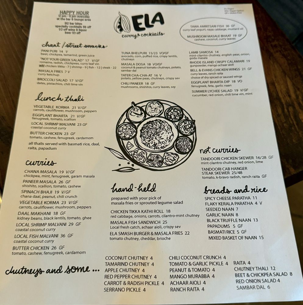 Ela Curry & Cocktails, located in Palm Beach Gardens, offers a diverse menu with a focus on curries and cocktails. With a range of options from ACHAARI PORK SHOULDER to LOCAL FISH MALVANI, their curries served with basmati rice are flavorful and satisfying. The CHAAT selections like CHILI CHICKEN "65" and DAHI BHALLE are perfect for sharing or as appetizers. Not just limited to curries, you can also enjoy dishes like DOUBLE TANDOORI CAB PRIME HANGAR STEAK SKEWER and ELA SMASH BURGER for a different culinary experience. The reviews from customers rave about the great food, friendly service, and upscale ambiance of Ela Curry. Don't miss out on their unique drinks and desserts, like the mango saffron cheesecake with cardamom. Overall, Ela Curry & Cocktails is a must-visit for a memorable dining experience.